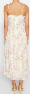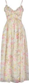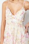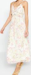 Ersefa Moda Askılı V Yaka Mor Çiçekli Desenli A-Kesim Fırfır Detaylı Astarlı Şifon Maxi Dokuma Elbise