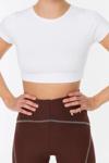 Moda Bisiklet Yaka Örme Fit Düz Desen Sportswear Super Crop Kısa Kol Bluz ürünümüz, hem şıklığı hem de rahatlığı bir arada sunar