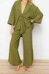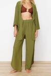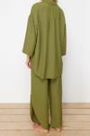 Moda Dokuma Düz Gömlek Yaka Plaj Dokuma Bağlamalı Keten karışımlı Gömlek Pantolon Takım ürünümüz, hem şıklığı hem de rahatlığı bir arada sunar.