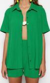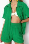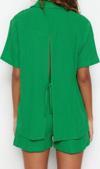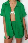 Moda Dokuma Düz Hakim Yaka Plaj Yeşil Dokuma Gömlek Şort Takım ürünümüz, hem şıklığı hem de rahatlığı bir arada sunar.
