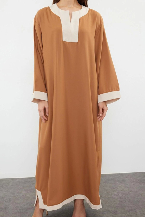 Moda Dokuma Rahat Kalıp Maxi V Yaka Düşük Kol Saten Basic Renk Bloklu Tesettür Giyim Kimono Kaftan ürünümüz, hem şıklığı hem de rahatlığı bir arada sunar.