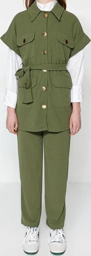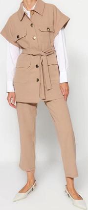Moda Düz Gömlek Yaka Casual Günlük Vizon Altın Düğmeli Yelek-Pantolon Örme Alt Üst Takım ürünümüz, hem şıklığı hem de rahatlığı bir arada sunar.