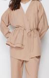 Moda Düz V Yaka Düşük Kol Casual Günlük Pamuklu Dokuma Kimono Pantolon Alt Üst Takım ürünümüz, hem şıklığı hem de rahatlığı bir arada sunar.