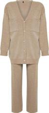 Moda Düz V Yaka Düşük Kol Casual Günlük Siyah Düğmeli Hırka-Pantolon Triko Alt-Üst Takım ürünümüz, hem şıklığı hem de rahatlığı bir arada sunar.