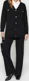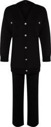 Ersefa Moda Düz V Yaka Düşük Kol Casual Günlük Siyah Düğmeli Hırka-Pantolon Triko Alt-Üst Takım