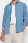 Ersefa Moda Erkek Gömlek Yaka Düz Desen Günlük Mavi Unisex Regular Fit %100 Pamuk Keten Görünümlü Gömlek