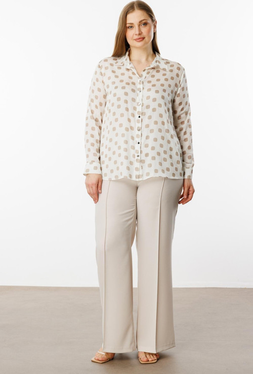 Detay: Bu puanlı oversize saten büyük beden gömlek, hem şıklığı hem de rahatlığı bir arada sunuyor. Hafif ve dökümlü yapısı sayesinde konforlu bir kullanım sağlarken, saten kumaşı zarif bir dokunuş katıyor. Oversize kesimi, modern ve rahat bir stil sunarken, puanlı deseni gömleğe hareketli bir görünüm kazandırıyor. Günlük kombinlerden özel davetlere kadar geniş bir kullanım alanına sahip olan bu gömlek, tarzınızı tamamlamak için ideal;