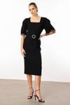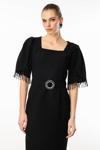 Detay: Akıcı ve kaliteli dokusuyla vücuda kusursuz bir şekilde oturan bu kare yaka midi boy kısa kollu elbise, zarif ve şık tasarımıyla göz dolduruyor. Kollarındaki şerit boncuk işlemeli aksesuar detayları tasarıma ince bir ışıltı katarken, taş detaylı tokalı kemeri bel vurgusunu ön plana çıkararak feminen bir siluet yaratıyor. Yarım kloş kesimi ile hareket özgürlüğü sunan bu elbise, stil sahibi kadınlar için hem rahat hem de zarif bir seçenek olarak öne çıkıyor.;