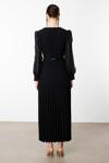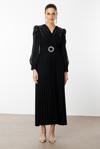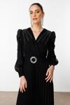 Detay: Akışkan ve hafif kumaşıyla şıklığı ve zarafeti bir araya getiren uzun ve piliseli etek tasarımlı bu elbise, zarif siluetiyle dikkat çekiyor. Taş işlemeli şık omuz detayları ve gösterişli taşlı kemer aksesuarıyla feminen bir hava kazanan bu tasarım, uzun ve şifon kollu yapısıyla elegan bir dokunuş sunuyor. V yaka ve kruvaze kapama detayları ise şıklığı tamamlayarak özel anlar için mükemmel bir seçim olmasını sağlıyor. Hem asil hem de modern bir görünüm arayanlar için kusursuz bir tercih;