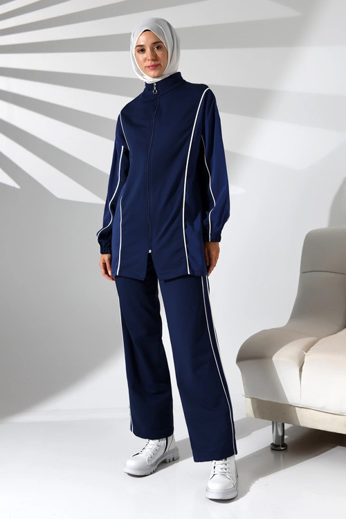 İki iplik, şardonsuz yumuşak kumaştan üretilen takım, fermuar kapamalı ve dik yakalı tasarımı ile modern bir duruş sunuyor.