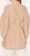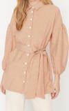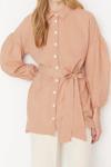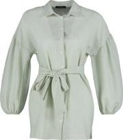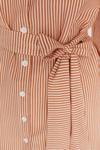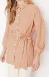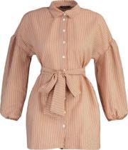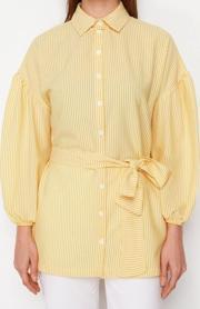 Ersefa Moda Kadın Tesettür Gömlek Yaka Çizgili Günlük Çizgili Kuşaklı Balon Kol Arkası Uzun Dokuma Gömlek