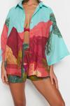 Moda Manzara Gömlek Yaka Düşük Kol Plaj Manzara Desenli Dokuma %100 Pamuklu Gömlek Şort Takım ürünümüz, hem şıklığı hem de rahatlığı bir arada sunar.