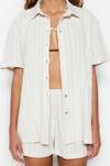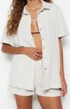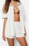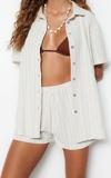 Moda Örme Düz Gömlek Yaka Plaj Ekru Dokuma Keten Karışımlı Gömlek Şort Takım ürünümüz, hem şıklığı hem de rahatlığı bir arada sunar.