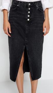 Moda Regular Düz Desen Günlük Midi Boy önden Düğmeli Yırtmaçlı Midi Denim Etek ürünümüz, hem şıklığı hem de rahatlığı bir arada sunar.Bu Etek ile zahmetsiz stil keşfedin.Günlük ve özel günleriniz de kullanım için ideal olan bu ürün, kaliteli materyali ve modern tasarımıyla ön plana çıkar.