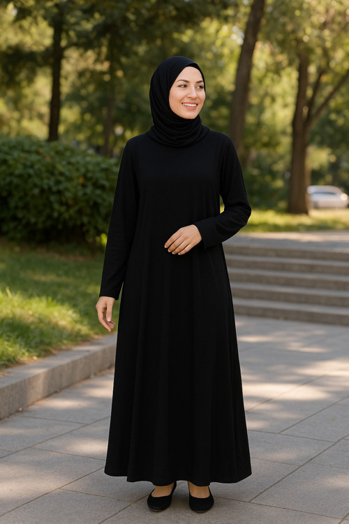 Şıklık ve konforu bir arada sunan siyah penye tesettür elbise, günlük kullanımda rahatlığı ön planda tutan kadınlar için tasarlandı.