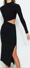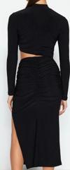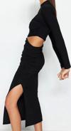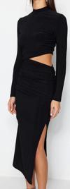 Moda Stil Fitted Dik Yaka Midi Boy Pencere Cut Out Detaylı Şık Abiye Elbise - Her ortama uyum sağlayan kadın elbiseleri, zarafeti ve şıklığı bir araya getirerek tarzınıza sofistike bir dokunuş katıyor.