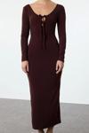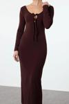 - - Kumaş Tipi:Örme - Kalıp:Fitted - Kol Boyu:Uzun - Kol Tipi:Standart Kol - Desen:Düz - Yaka Tipi:U Yaka - Renk:Kahverengi - Ürün Detayı:Göğüsten Bağlama - Cep:Cepsiz - Astar Durumu:Astarsız - Boy:Maxi - Persona:Smart - Siluet:Bodycone - Ortam:Kokteyl - Dokuma Tipi:Sandy - Kemer/Kuşak Durumu:Kemersiz - Sürdürülebilirlik Detayı:Hayır - Materyal Bileşeni:95% Polyester, ,5% Elastan - Yıkama Talimatı:T10 - Yaş:Tüm Yaş Grupları -