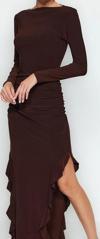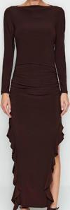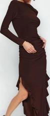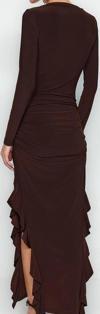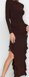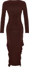 Moda Stil Regular Bisiklet Yaka Midi Boy Eteği Volanlı Kayık Kaya Esnek Örme Elbise - Her ortama uyum sağlayan kadın elbiseleri, zarafeti ve şıklığı bir araya getirerek tarzınıza sofistike bir dokunuş katıyor.