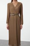 Moda Stil Regular Kruvaze Midi Boy Kemerli Düz Kemerli Dokuma Elbise - Her ortama uyum sağlayan kadın elbiseleri, zarafeti ve şıklığı bir araya getirerek tarzınıza sofistike bir dokunuş katıyor.
