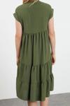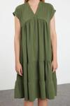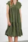 Moda Stil Regular V Yaka Midi Boy Düz Geniş Kesim Eteği Volanlı Aerobin Dokuma Elbise - Her ortama uyum sağlayan kadın elbiseleri, zarafeti ve şıklığı bir araya getirerek tarzınıza sofistike bir dokunuş katıyor.