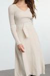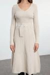 Moda Stil Regular V Yaka Midi Boy Triko Kemerli Volanlı Elbise - Her ortama uyum sağlayan kadın elbiseleri, zarafeti ve şıklığı bir araya getirerek tarzınıza sofistike bir dokunuş katıyor.