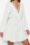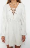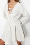 Moda Stil Regular V Yaka Mini Boy Dokuma Bağlamalı Keten Karışımlı Plaj Elbisesi - Her ortama uyum sağlayan kadın elbiseleri, zarafeti ve şıklığı bir araya getirerek tarzınıza sofistike bir dokunuş katıyor.
