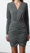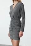 - - Kumaş Tipi:Dokuma - Materyal:Dokuma - Kalıp:Regular - Kol Boyu:Uzun - Kol Tipi:Standart Kol - Desen:Düz - Yaka Tipi:V Yaka - Renk:Gri - Ürün Detayı:Büzgü / Drape - Cep:Cepsiz - Astar Durumu:Astarsız - Boy:Mini - Persona:Feminine - Siluet:Bodycone - Ortam:Gündüz / Gece - Dokuma Tipi:Poliviskon - Kemer/Kuşak Durumu:Kemersiz - Sürdürülebilirlik Detayı:Hayır - Materyal Bileşeni:65% Polyester, ,33% Viskoz, ,2% Elastan - Yıkama Talimatı:T10 - Yaş:Tüm Yaş Grupları -