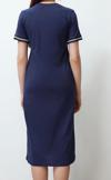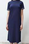 Moda Stil Relaxed Bisiklet Yaka Midi Boy Triko Bant Detaylı Kısa Kol Esnek Örme Elbise - Her ortama uyum sağlayan kadın elbiseleri, zarafeti ve şıklığı bir araya getirerek tarzınıza sofistike bir dokunuş katıyor.