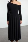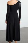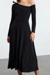 Moda Stil Slim Asimetrik Yaka Midi Boy Fiyonk Detaylı Kuşaklı Skater Örme Elbise - Her ortama uyum sağlayan kadın elbiseleri, zarafeti ve şıklığı bir araya getirerek tarzınıza sofistike bir dokunuş katıyor.