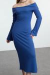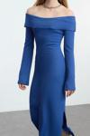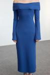 - - Kumaş Tipi:Örme - Materyal:Polyester - Kol Tipi:Düşük Kol - Kalıp:Slim - Kol Boyu:Uzun - Desen:Düz - Yaka Tipi:Carmen Yaka - Renk:Mavi - Ürün Detayı:Yırtmaçlı - Cep:Cepsiz - Astar Durumu:Astarsız - Boy:Midi - Persona:Smart - Siluet:Bodycone - Ortam:Gündüz / Gece - Dokuma Tipi:Selanik - Kemer/Kuşak Durumu:Kemersiz - Sürdürülebilirlik Detayı:Hayır - Materyal Bileşeni:100% Polyester - Yıkama Talimatı:T10 - Yaş:Tüm Yaş Grupları -