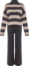 Moda Triko Çizgili Dik Yaka Casual Günlük Geniş Kalıp Çizgili Triko Alt-Üst Takım ürünümüz, hem şıklığı hem de rahatlığı bir arada sunar.