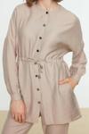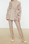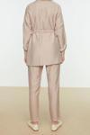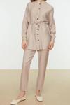 Ersefa Moda Yüksek Bel Bisiklet Yaka Düşük Kol Casual Günlük Beli Bağlamalı Gömlek-Pantolon Dokuma Takım