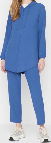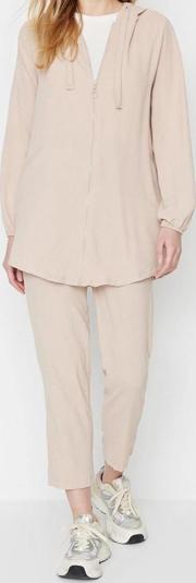 Ersefa Moda Yüksek Bel Kapüşonlu Casual Günlük Taş Kapüşonlu Fermuarlı Aerobin Hırka-Pantolon Dokuma Takım