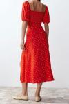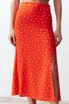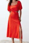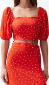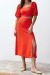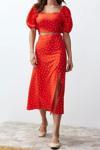 Ersefa Moda Yüksek Bel Puantiyeli Kare Yaka Balon Kol Yırtmaçlı Midi Dokuma Puantiyeli Alt-Üst Takım