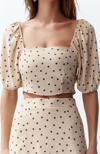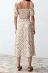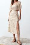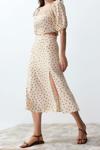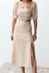 Ersefa Moda Yüksek Bel Puantiyeli Kare Yaka Balon Kol Yırtmaçlı Midi Dokuma Puantiyeli Alt-Üst Takım