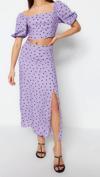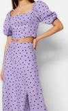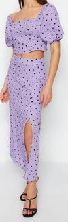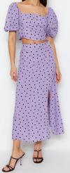 Ersefa Moda Yüksek Bel Puantiyeli Kare Yaka Balon Kol Yırtmaçlı Midi Dokuma Puantiyeli Alt-Üst Takım