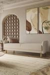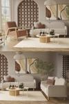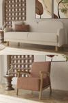 Yumuşak krem tonlarındaki iki kişilik koltuk, açık ahşap detaylı koltukla uyum içinde bir bütünlük oluşturuyor.