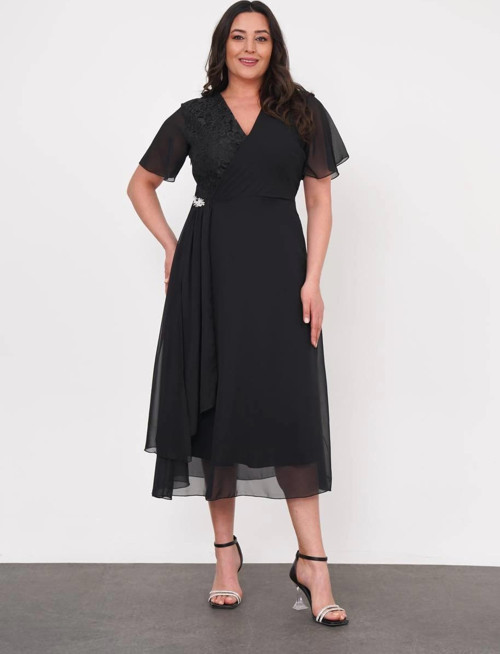 ModaSehle Büyük Beden Üst Dantel Detaylı Şifon Kısa Kollu Abiye Elbise