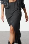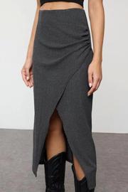 Ersefa Modern Tarz Astarsız Örme Midi Boy Kruvaze Dokulu Büzgü Drape Detaylı Midi Etek