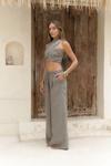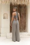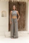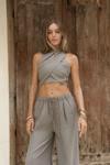 %100 keten kumaş, katlı çapraz yaka, boyundan bağlamalı crop pantolon takım. Yan gizli fermuar detaylı.