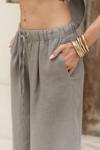 Yüksek bel keten pantolon. Elastik bel bantlı, ayarlanabilir bağcıklı, geniş paça tasarımlı.