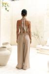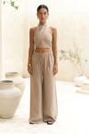%100 keten kumaş, katlı çapraz yaka, boyundan bağlamalı crop pantolon takım. Yan gizli fermuar detaylı.