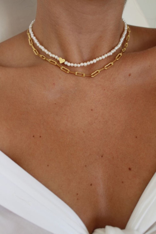 Zarafetin ve modern tasarımın buluştuğu bu ikili kolye seti, inci kalp detaylı kolye ile gold ataç zincirin şık uyumunu bir araya getiriyor.