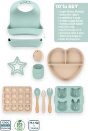 Moki Silikon 10’Lu Set Latte Bej-Spring Yeşil / Önlük, Tabak, Kaşık, Bardak, Buz Kalıbı, Diş Kaşıyıcı...