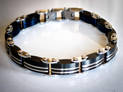 Mavi ve Siyah Çift Taraflı Çelik Erkek Bileklik – İki Tarafı Kullanılabilir Modern ve Maskülen Tasarım