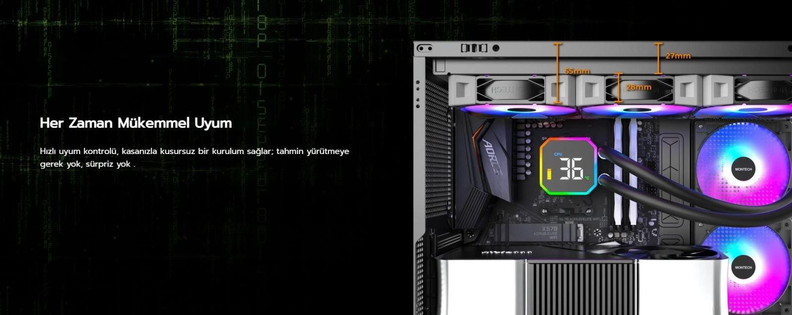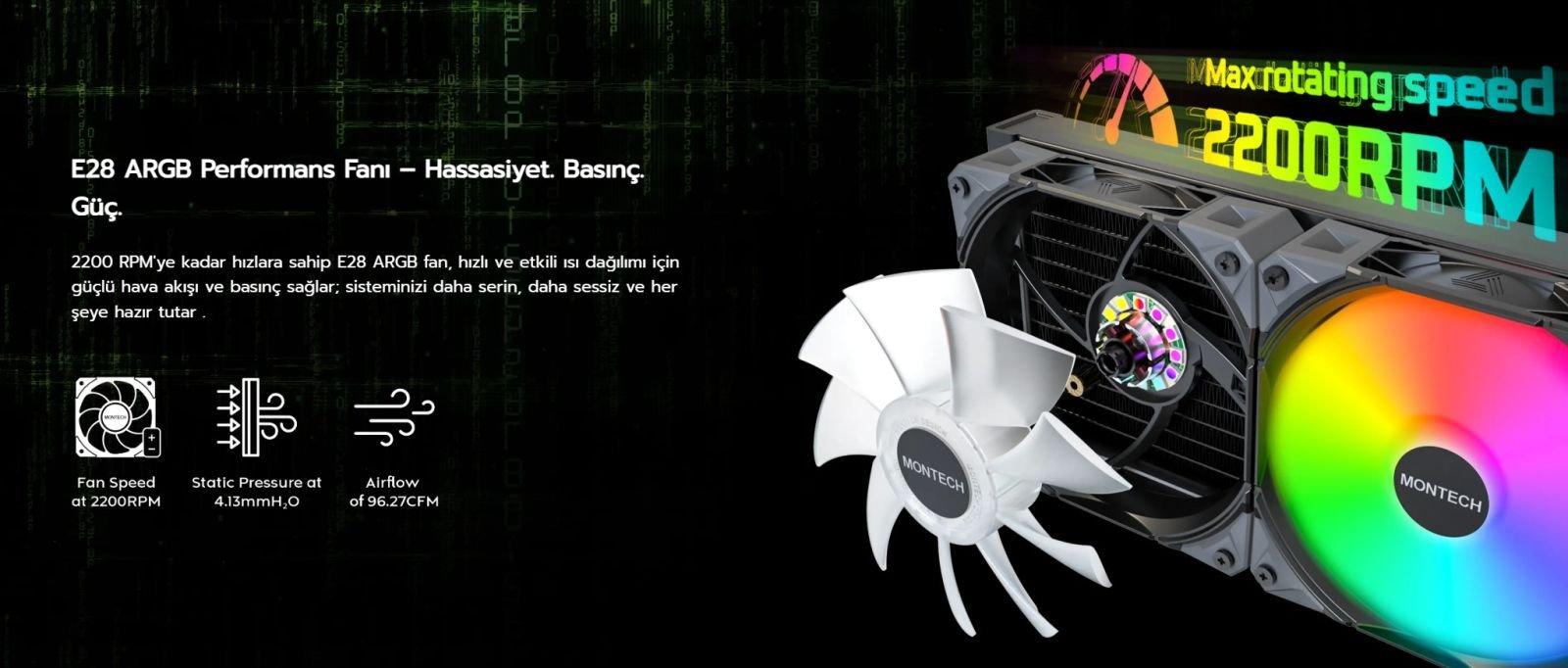 Montech HyperFlow Dijital 360 CPU Sıvı Soğutucu, 3100 RPM Pompalı 360 mm AIO, 3×120 mm E28 ARGB Fanl