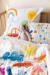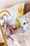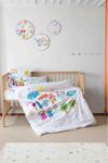 Paket içeriğinde yer alan 1 adet nevresim takımı, kırlent ve 3'lü tablo setiyle bebek odasına şıklık katar.