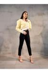 Düğme ve fermuar kapama şekli pratik kullanım imkanı tanırken, yüksek bel tasarımı vücut hatlarını zarifçe sarar