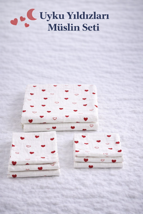 More Home Müslin Bezi Set 5 Parça % 100 Pamuklu Parça Kalpli Beyaz Kırmızı