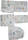 Organik müslin bezi bebek set tüm içeriği örtü, mendil ve omuz bezi torba %100 organik pamuk iplikten üretilmiştir.